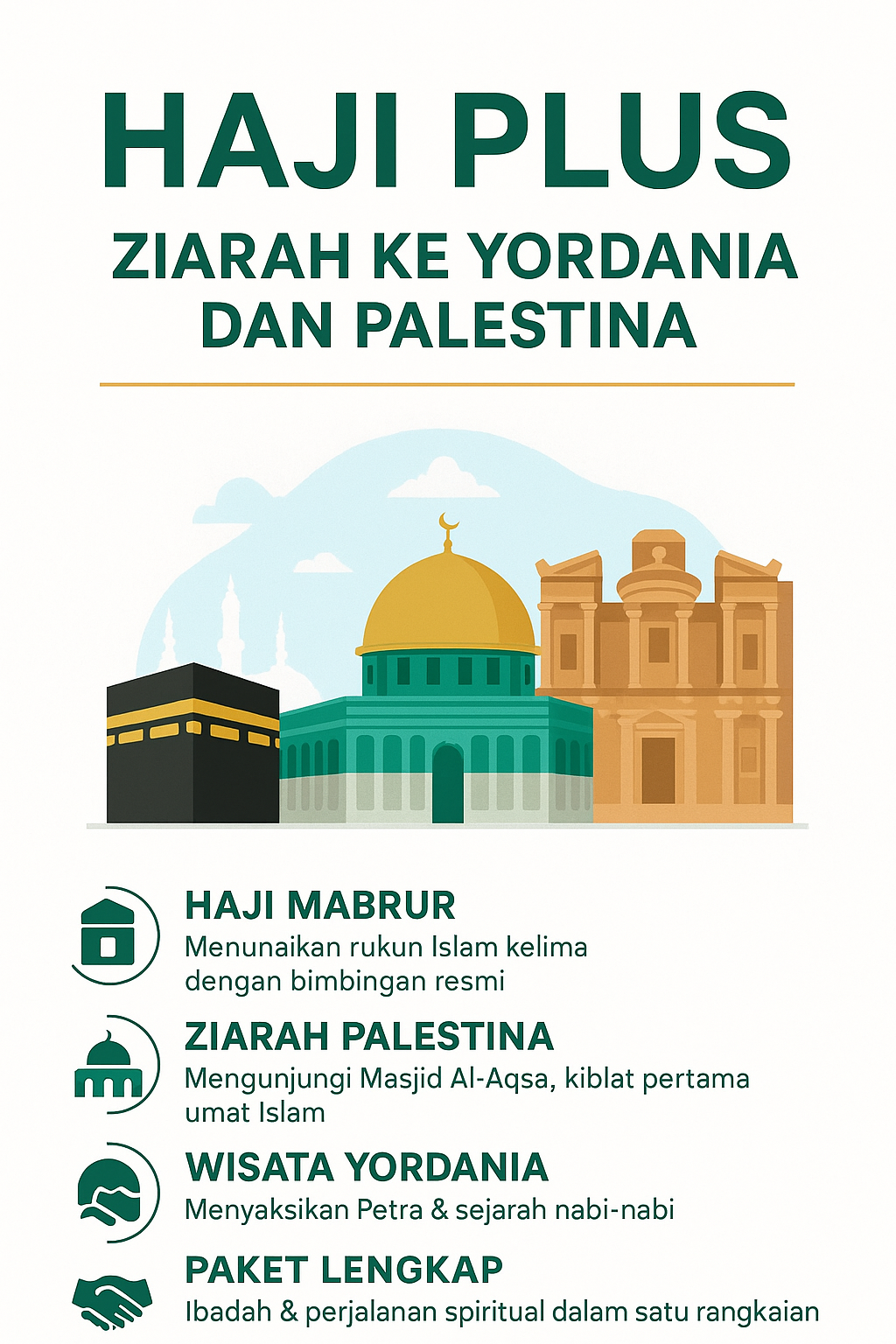 Nikmati haji plus ziarah ke Yordania dan Palestina. Perjalanan spiritual lengkap dengan kunjungan ke Masjid Al-Aqsa dan situs bersejarah Islam.